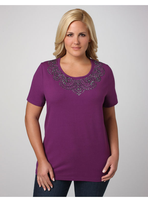 Available in Plus Size. Marquise-shaped beads flicker and shine on the embellished scoop neckline of our soft-touch tee. Adds a touch of casual opulence to jeans or layered under a jacket or cardigan. Catherines tops are designed for the plus size woman to guarantee a flattering fit.. Color: Gloxinia